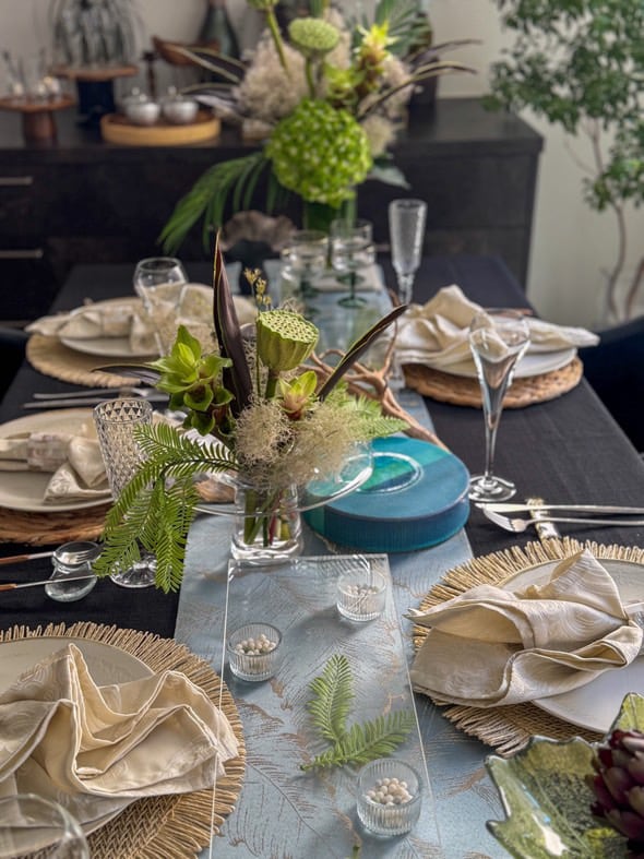 バナナリーフ テーブルランナー 200cm TR-200-BNF-LBG エレガントなバナナリーフデザインが魅力的なテーブルランナー。 自然の美しさを感じさせるこのアイテムは、ダイニングやリビングに爽やかな印象を与え、普段使いはもちろん、特別なおもてなしの席でも活躍します。 (写真テーブルサイズ 80cm×130cm) ■ サイズ サイズ:幅33cm x 長さ200cm ■ カラー ライトブルーグレー×シャンパンゴールド ■ 素材 ポリエステル100% ■ お手入れ/取り扱い注意事項 ・手洗いや洗濯機の優しいモードで洗えますが、色移りの恐れがありますので、他の衣類とは分けて洗ってください。 ・直射日光を避けて、乾燥時は陰干しを推奨します。 ■ 発送・注文に関する情報や注意事項 ・ご注文から1週間以内に発送いたしますが、在庫状況により前後する場合がありますのでご了承ください。 ・返品・交換は未使用の状態に限りますが、カラーやサイズの相違によるものは承れませんので、必ずご確認の上ご注文ください。 ■ その他の情報や注意事項 ・製品の色合いやサイズはモニター環境によって実物とは多少異なる場合があります。 ・製品に関してご不明点がございましたら、お気軽にお問い合わせください。 お問い合わせは、ショップのお問い合わせからお願いいたします。