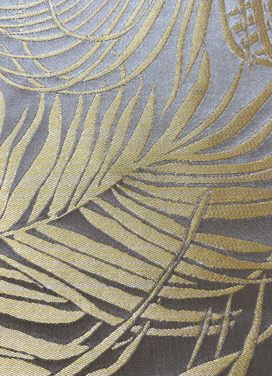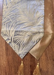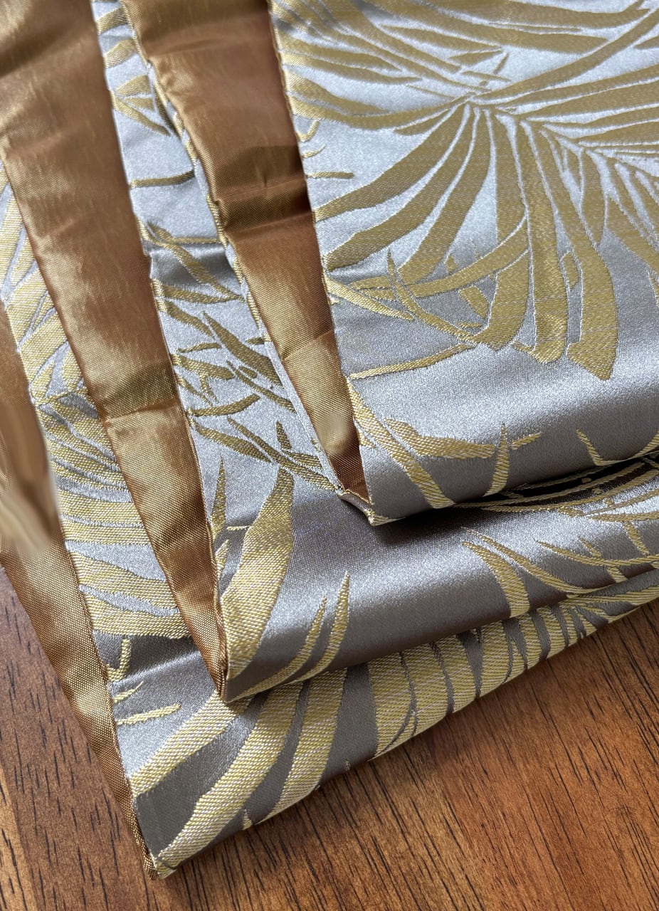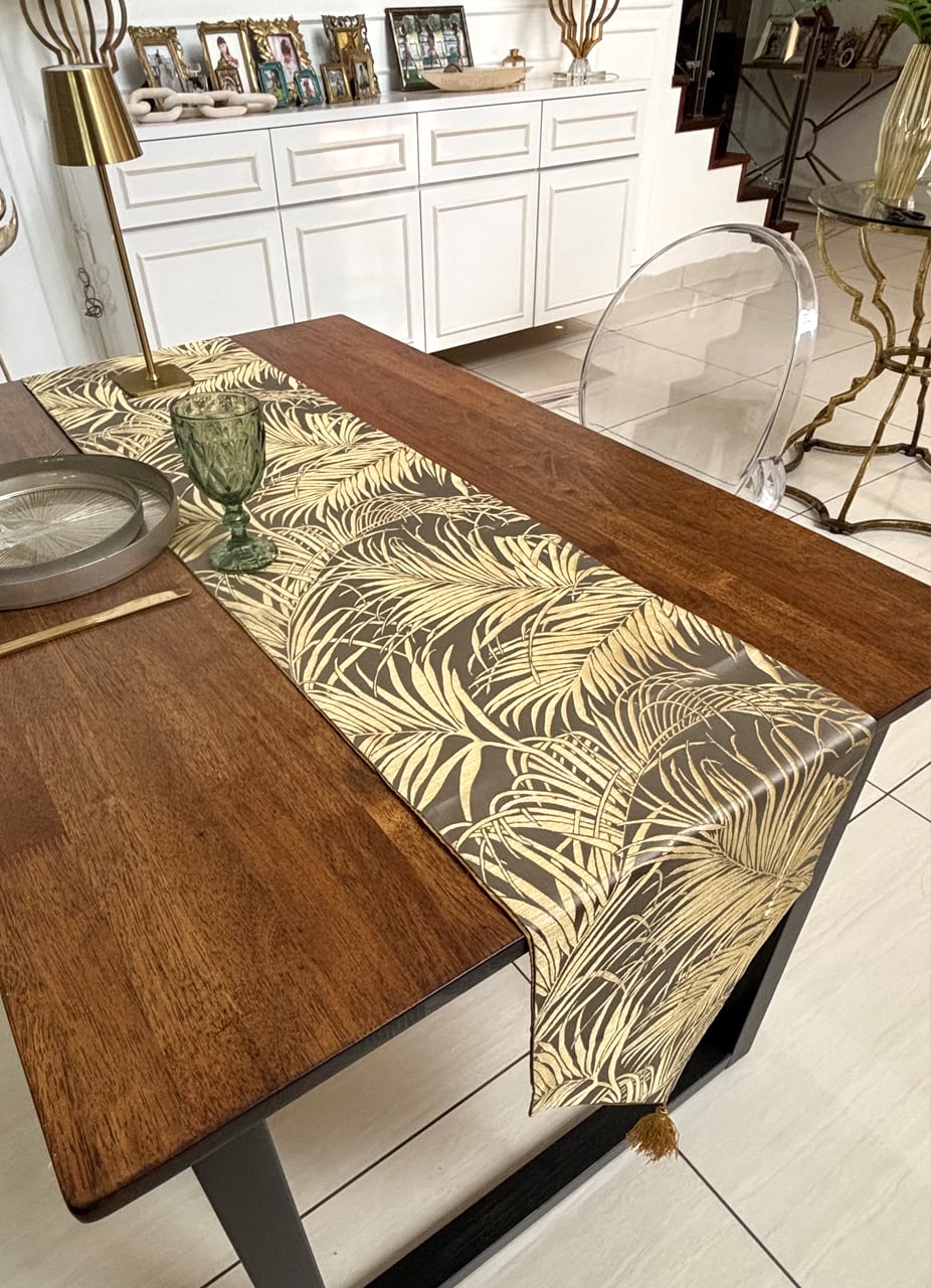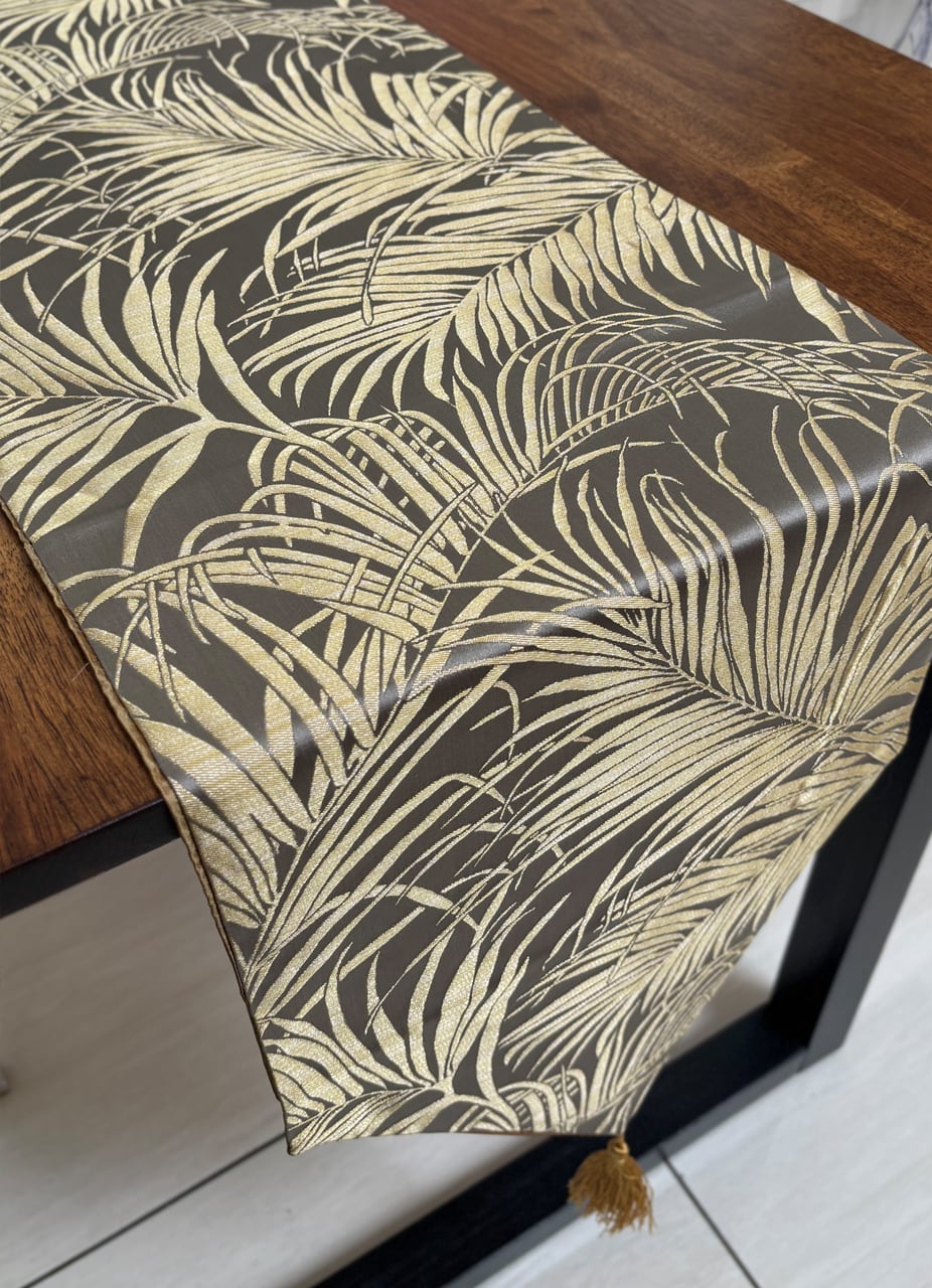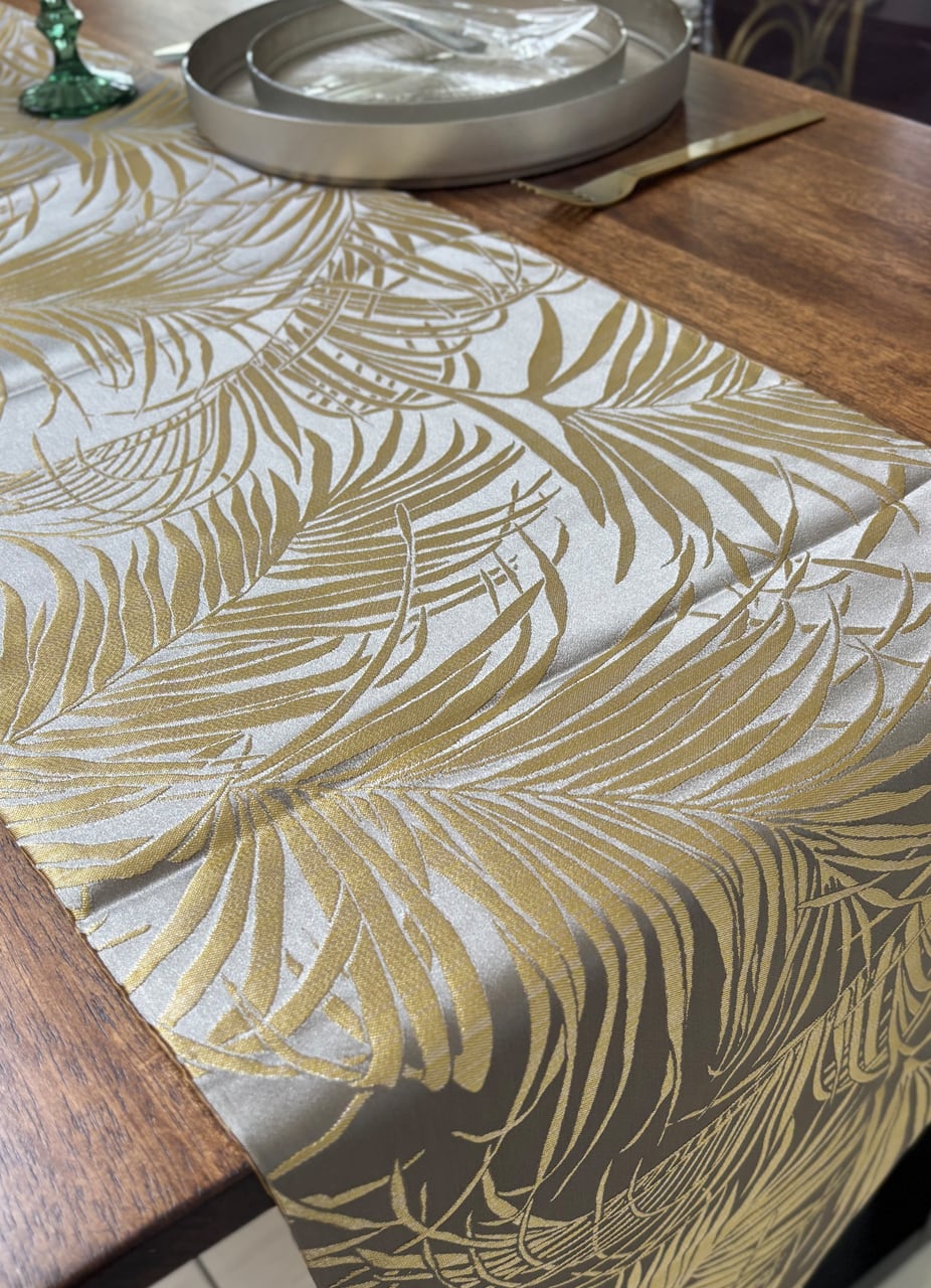 光沢のあるゴールドの椰子の葉デザインが印象的なテーブルランナー。